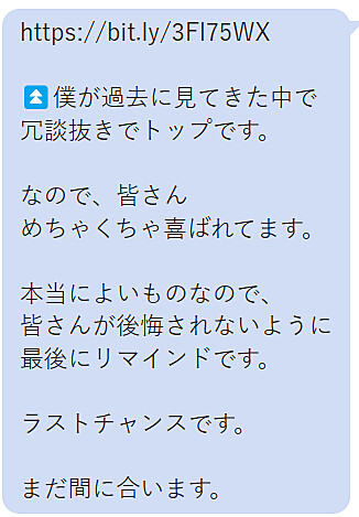 ↑他の発信者に比べて僕のメッセージの文字数はこんな感じで短いです。そして、リンク先に伝えたいことを書くようにしてます。リンク先を開いて貰う必要はあるため、読者がクリックしたいようなワードを選択しております!