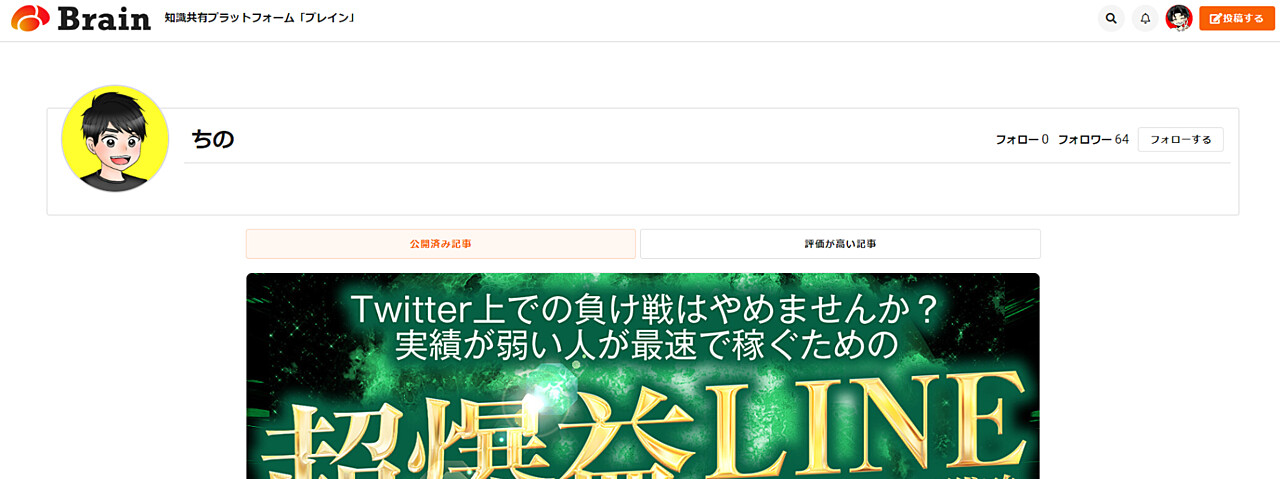 Brain上で良さそうなBrainがあったとして、その販売者を見たことが無い時ってたまにありますよね?だから、LPは魅力的だけど不安になるみたいな感じになります。ですが、そんな人のBrainがとんでもなくハイクオリティなことは多々あります。それを確認するために僕は必ず、その人のTwitterに飛びます。そこで、FF比が低すぎる人のBrainだったら僕は買いません。もちろんFF比が低くても良い商品のことはありますが、ハズレ商品を買ってしまうリスクが高いため僕は買いません。